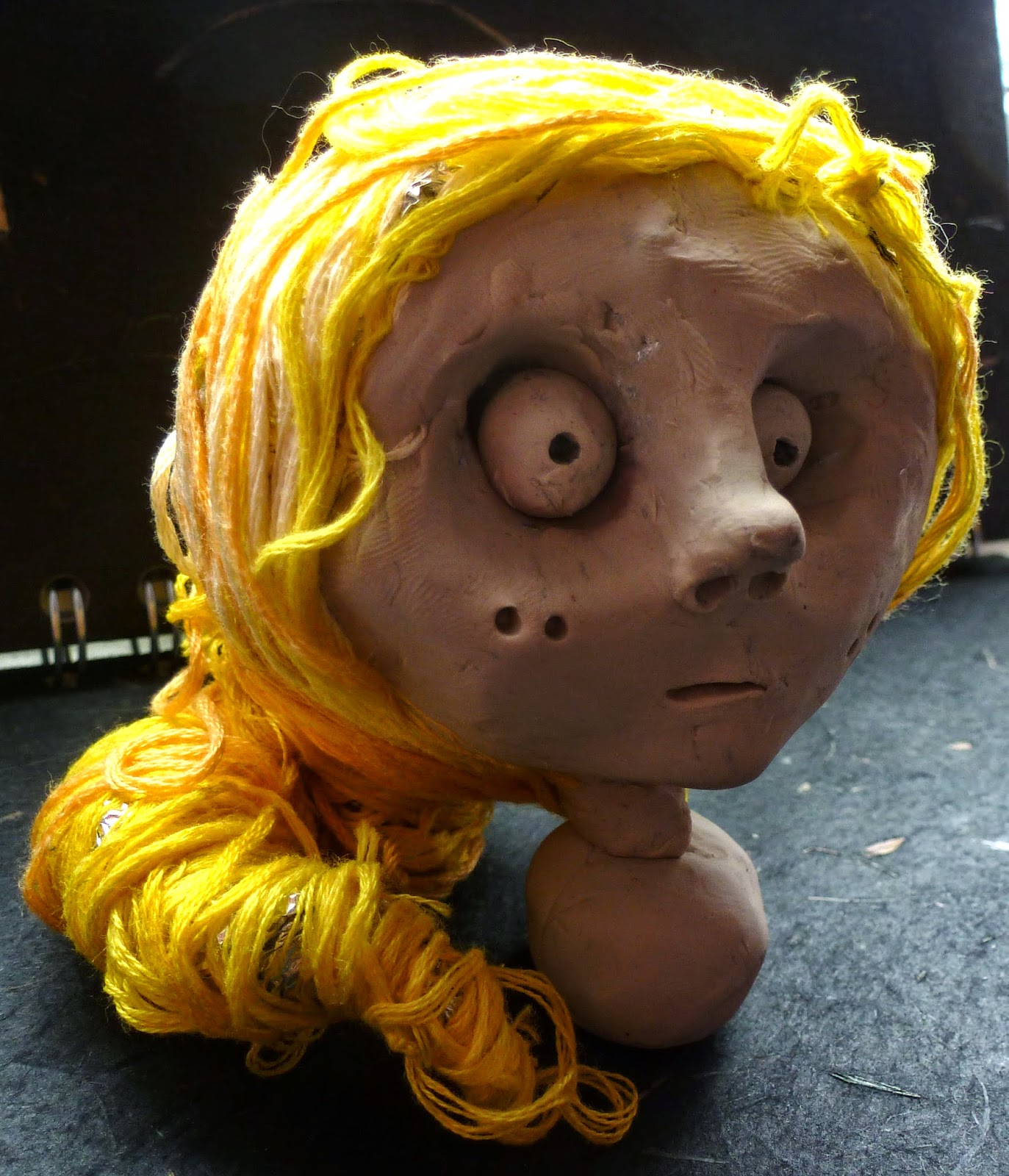 I decided to do some quick rough sculpts in plasticine to help me develop Una's face further and choose which way I wanted to take it. I found bringing my drawings into 3D really helpful, especially since the eventual puppet would of course be a real 3D object. I really liked the plaited ponytail wrapping over the shoulder as a hairstyle, however the thread I used for the hair was very vibrant (I just used what threads I already had) so I would want the hair to be a much more subtle colour. Although I do like the big Tim Burton type eyes as a style I felt Una called for something more delicate... so more exploration was needed.